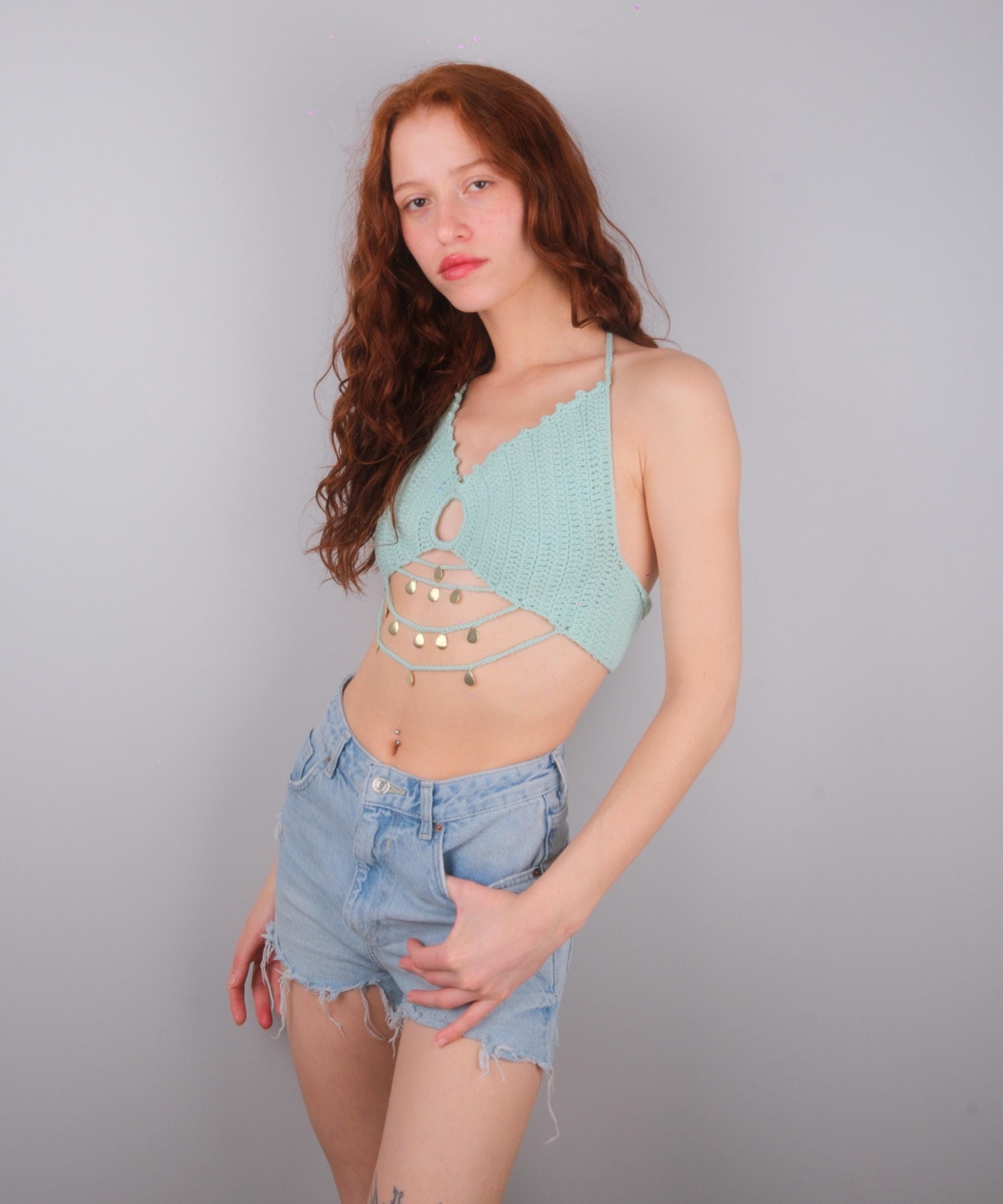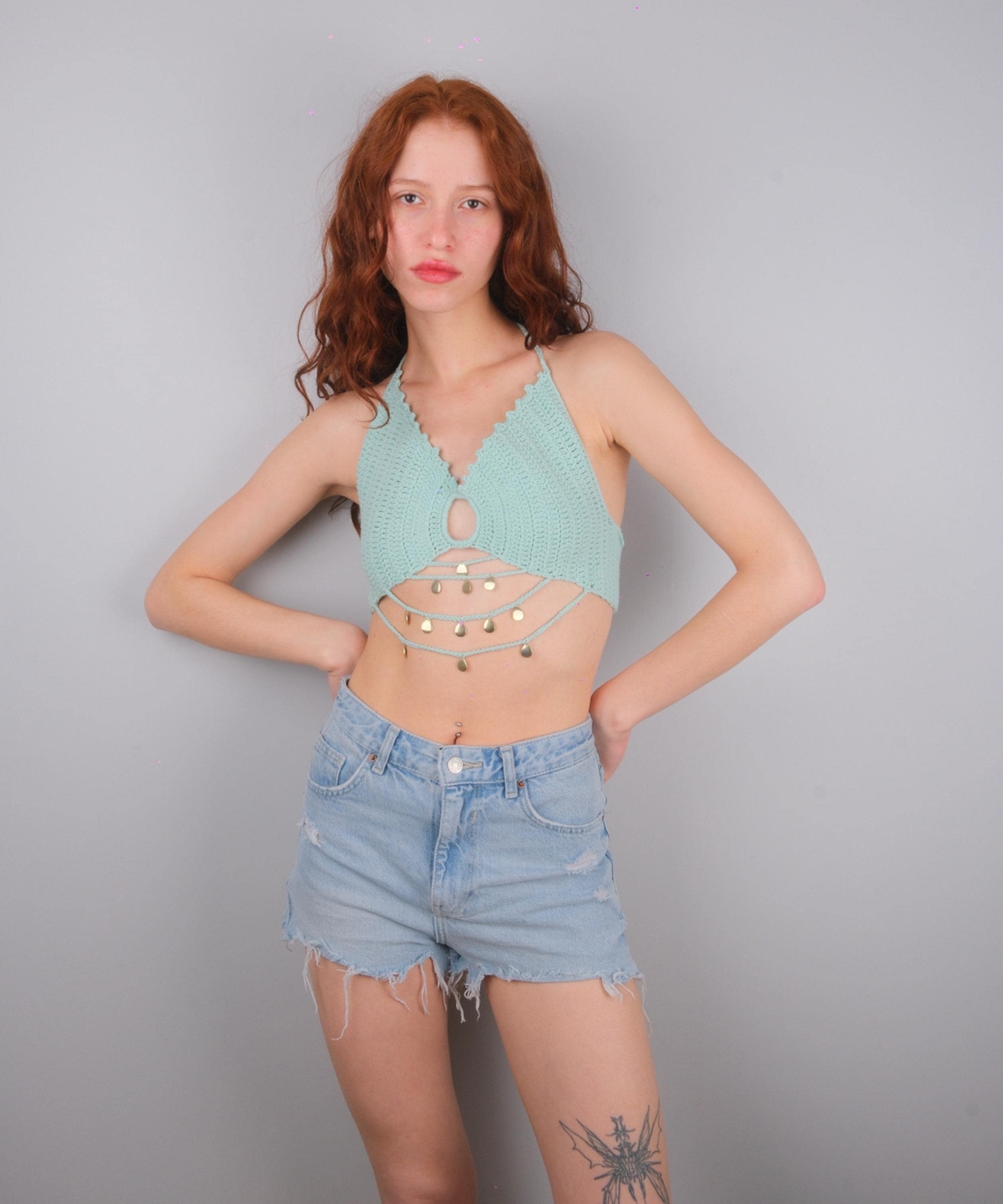 Mint Green Crochet Halter Top with gold coin details, designed for festivals, rave outfits, beach parties, and summer styling.