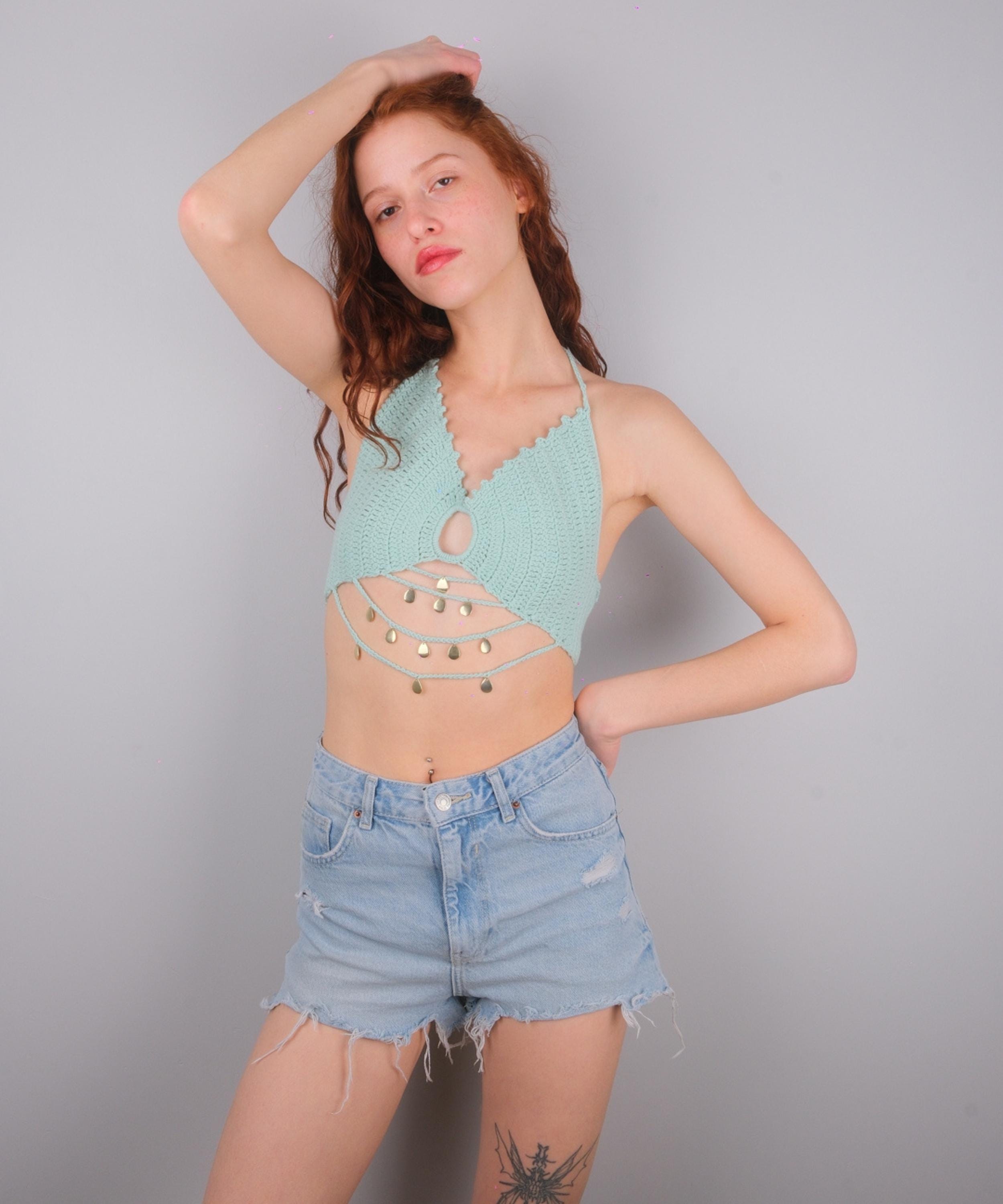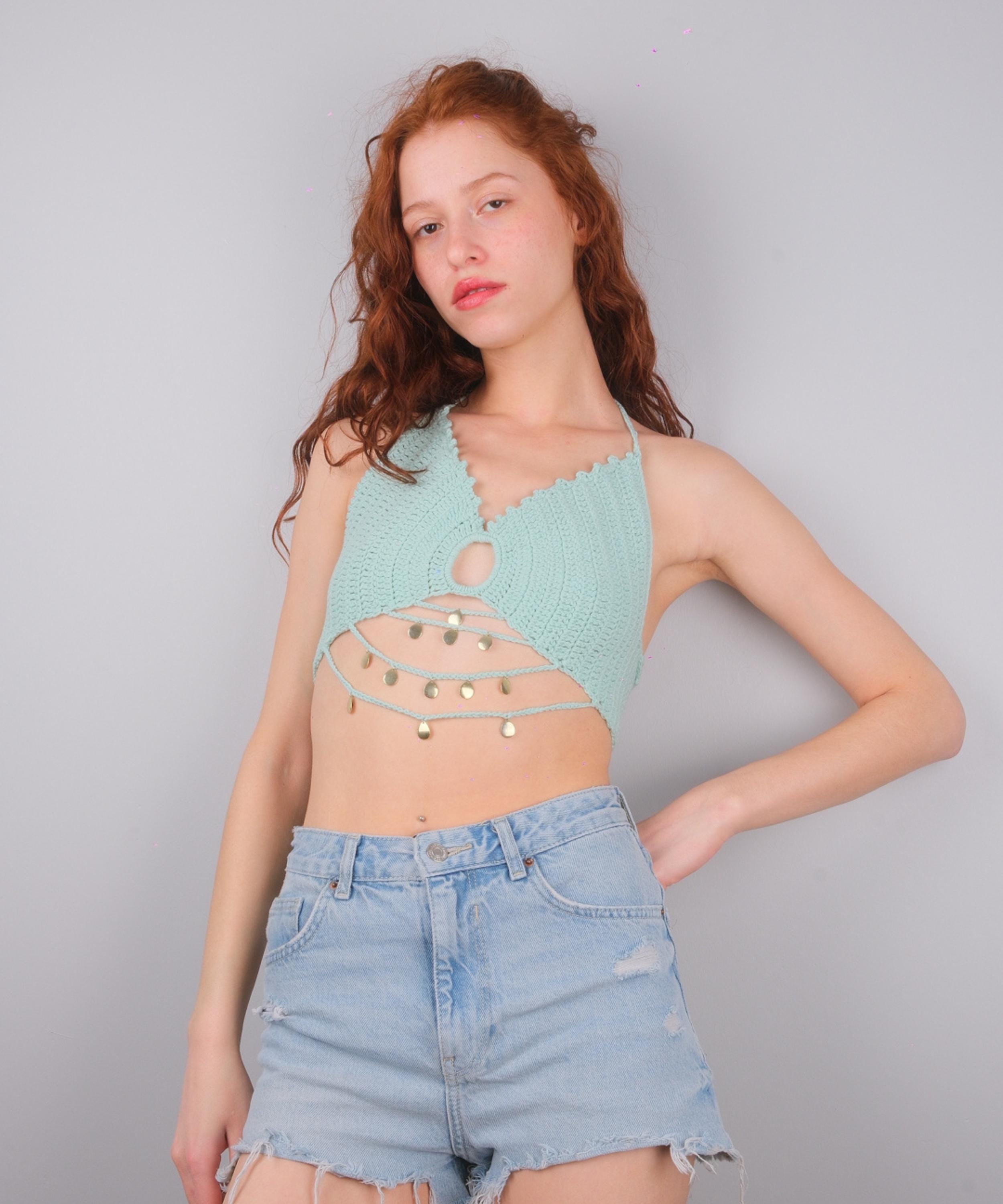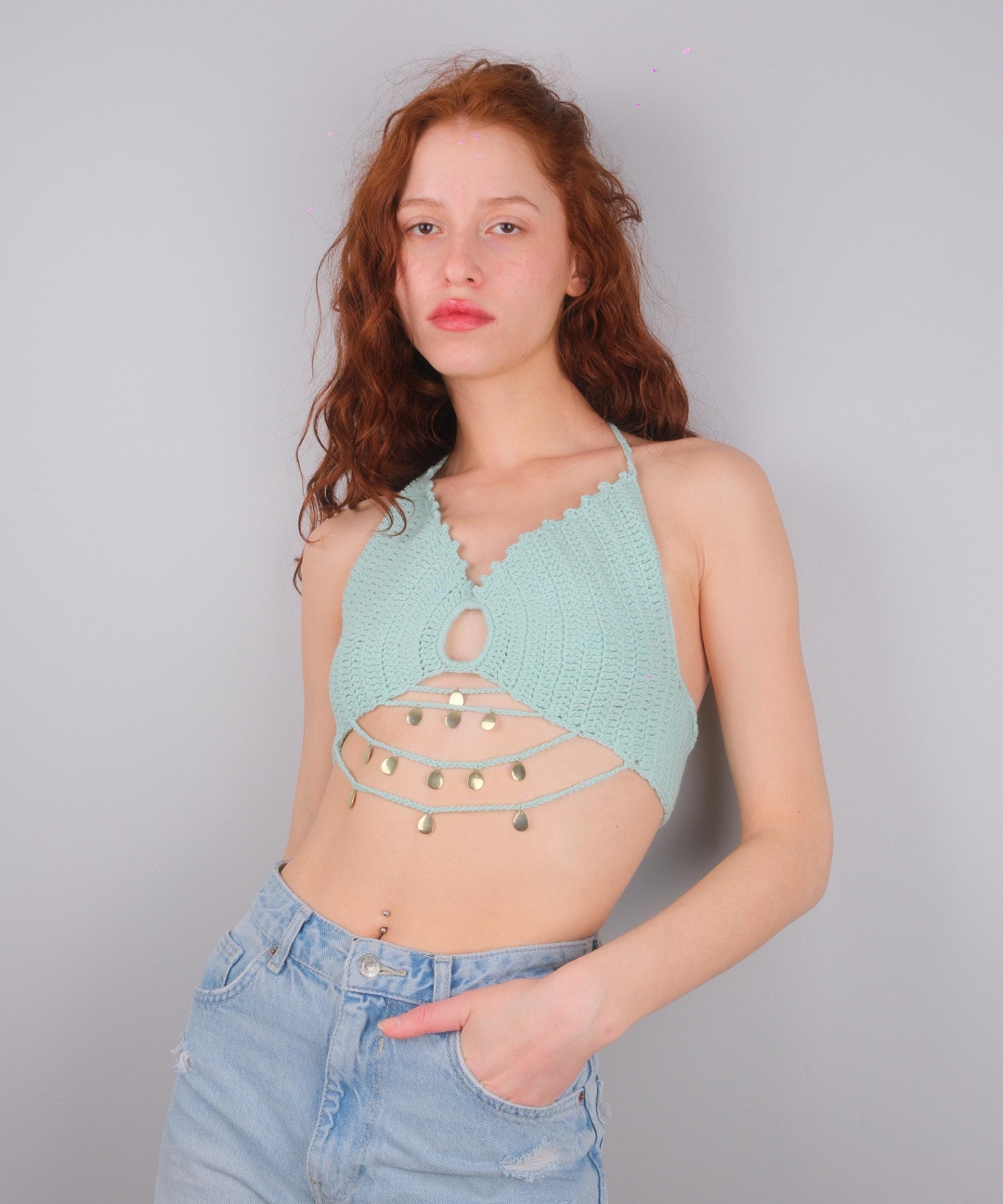 Mint Green Crochet Halter Top With Gold Coins, Boho Festival Bralette Summer Crop