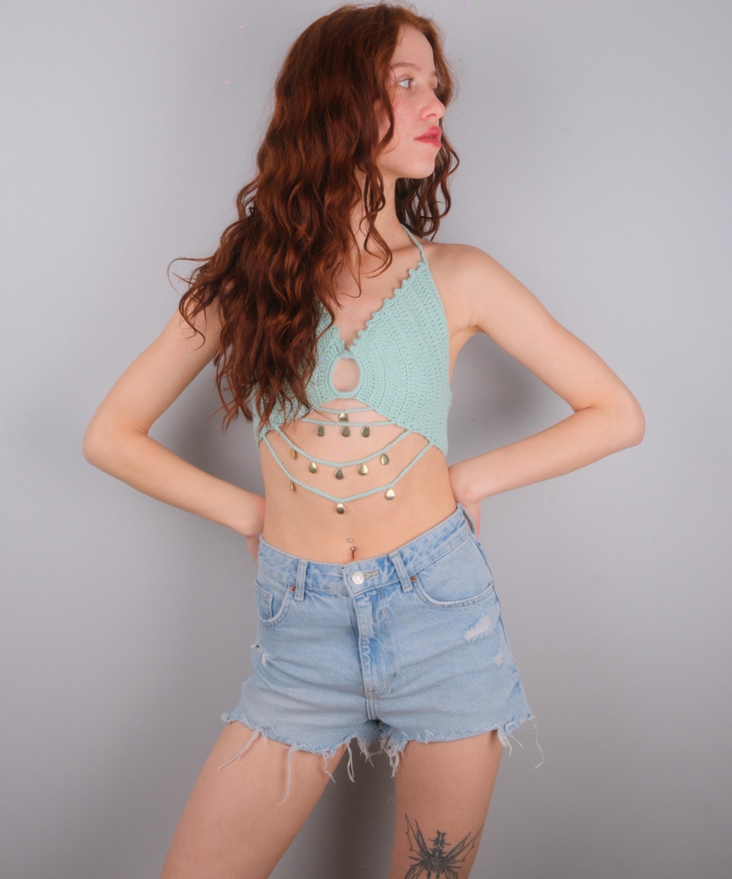 Designed for the free-spirited soul, this handmade bralette features elegant gold-tone coins dangling from the hem, creating a mesmerizing movement as you dance. The keyhole detail on the front adds a sexy and modern touch.