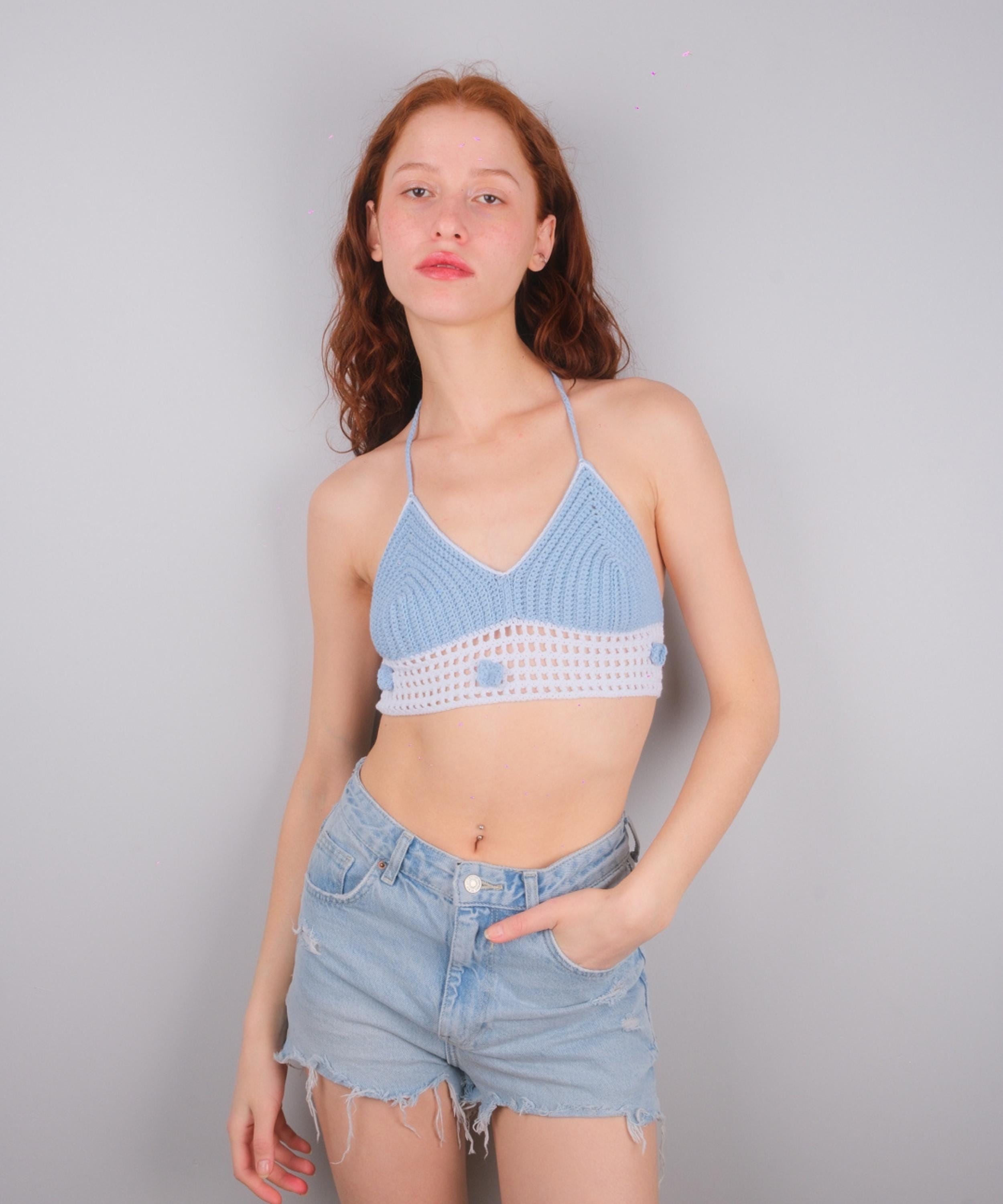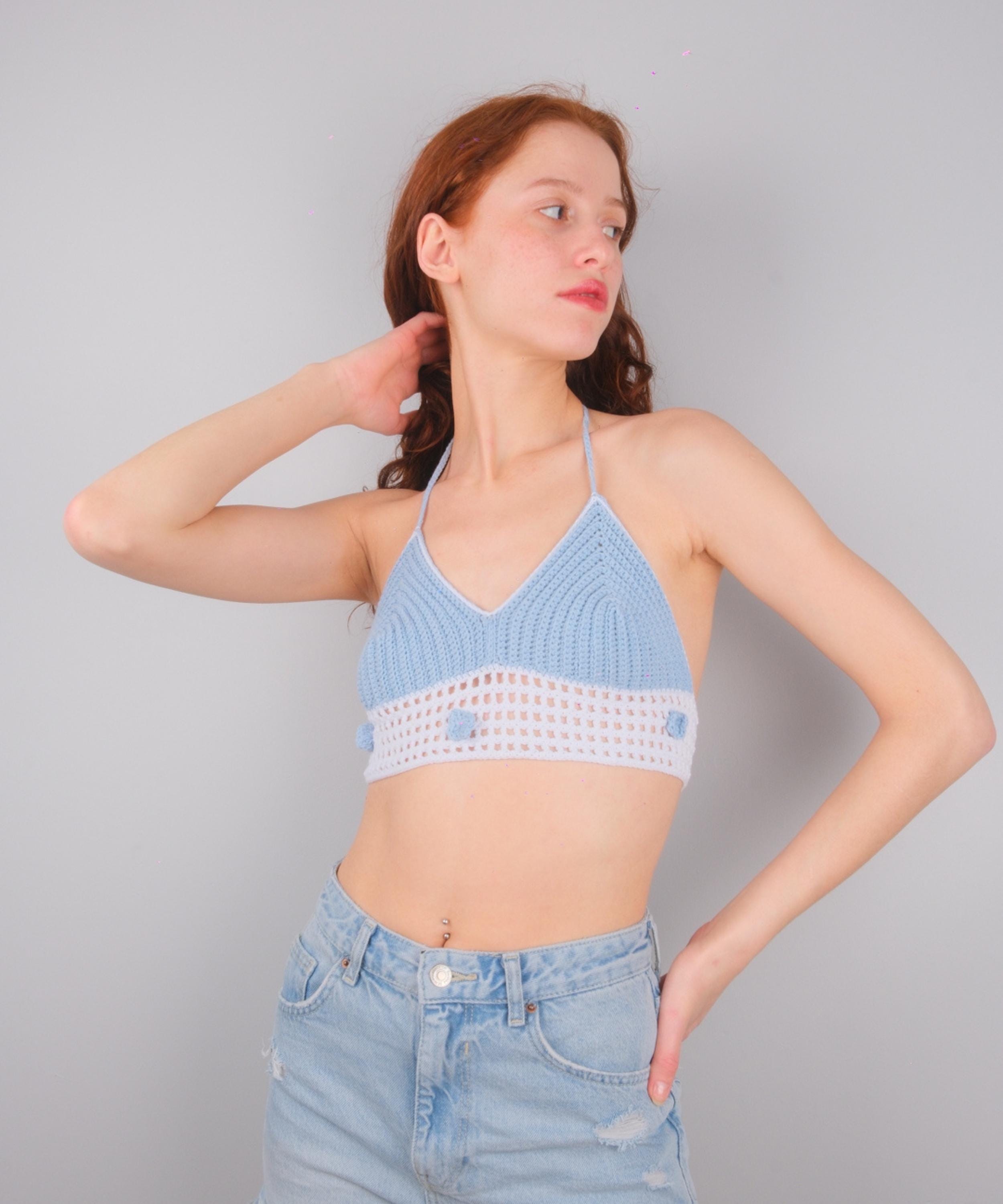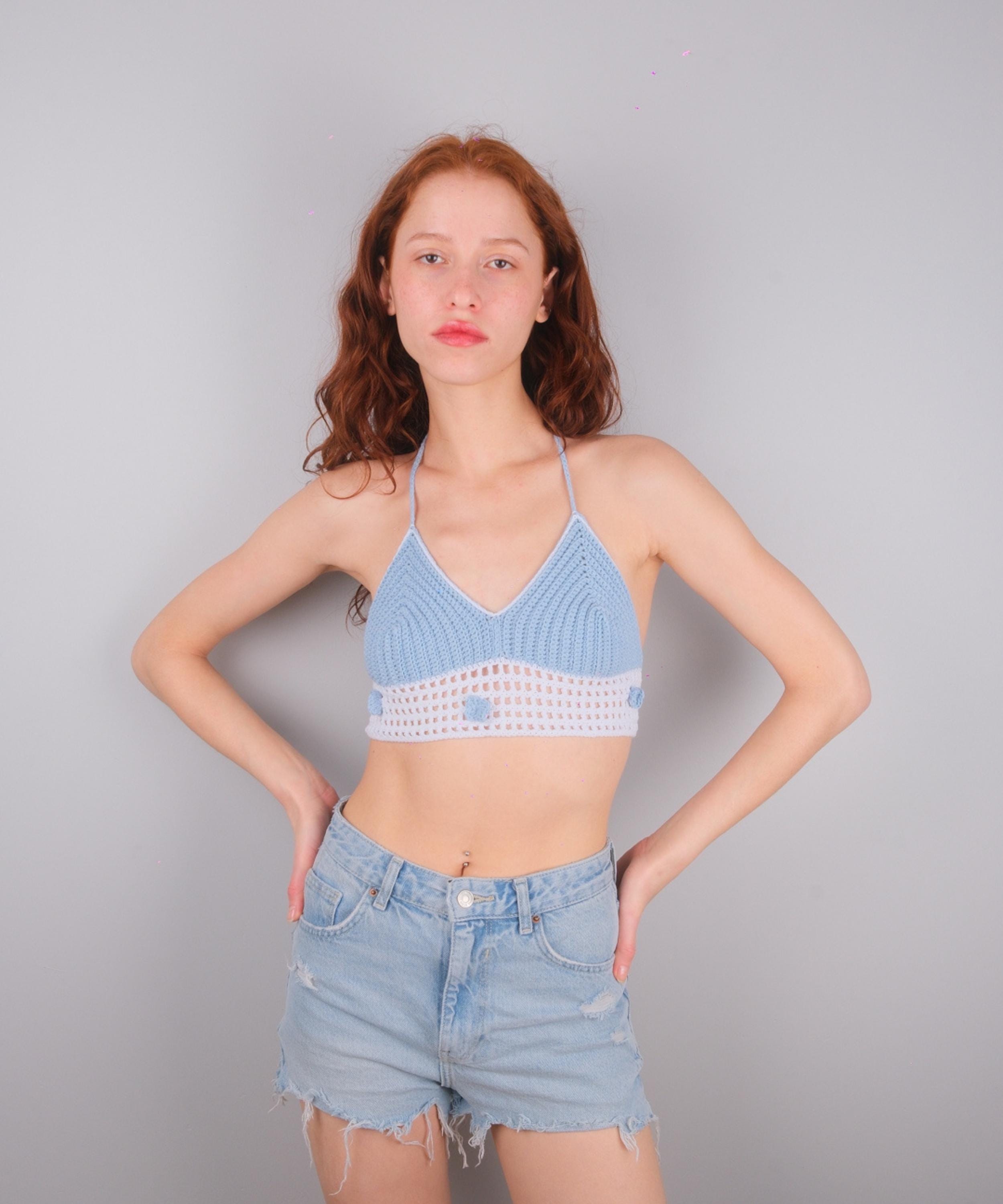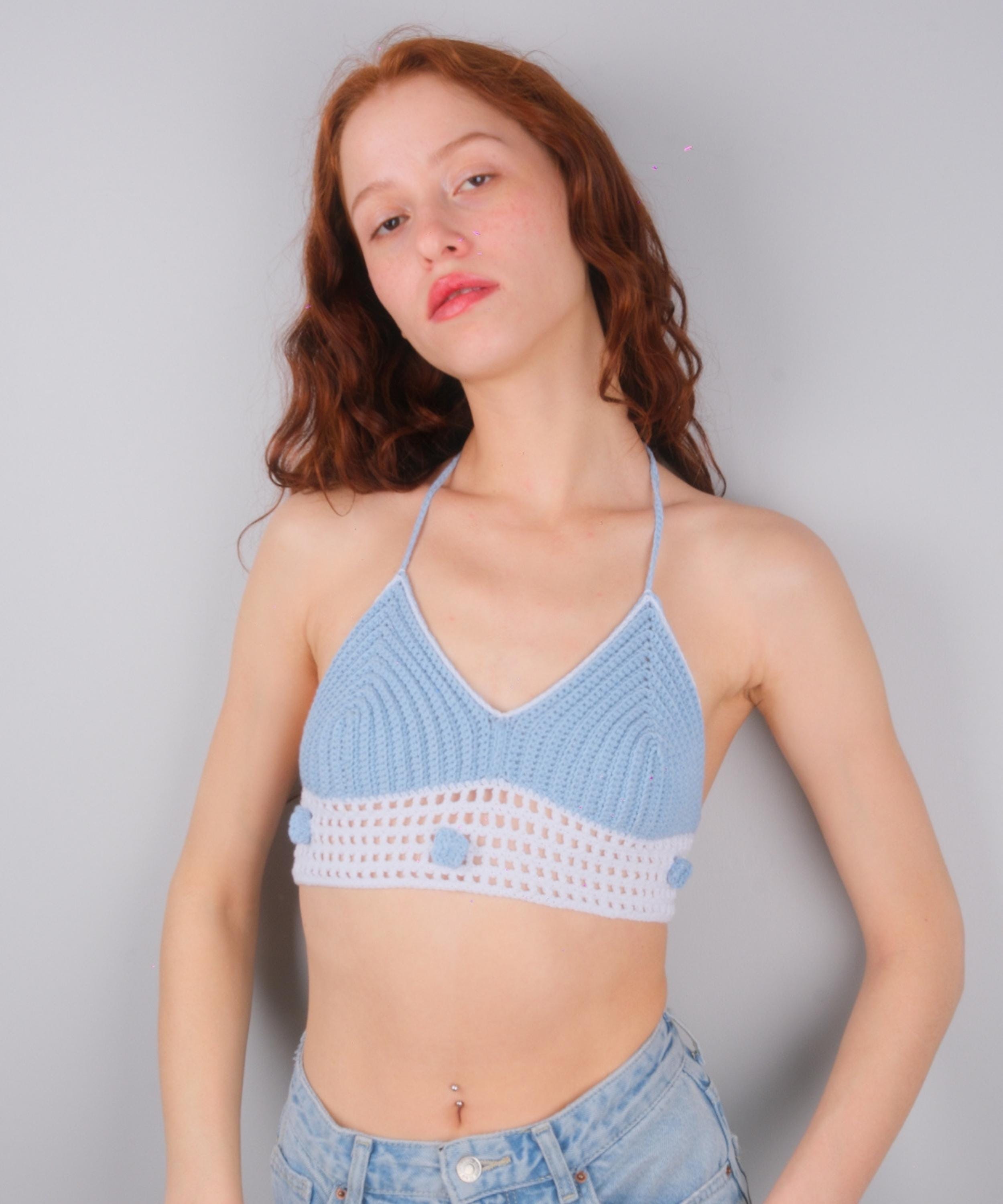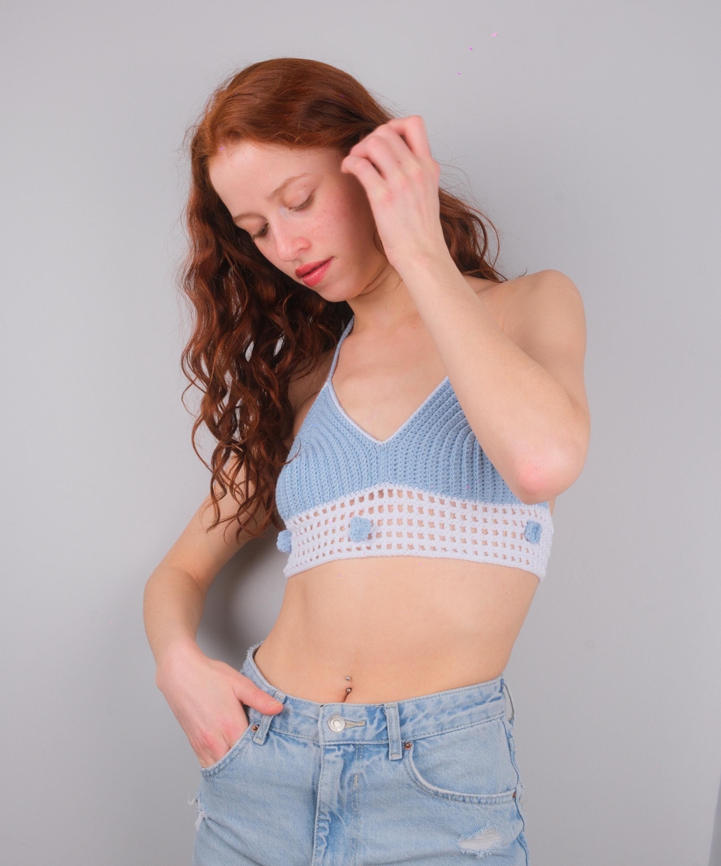 Blue & White Crochet Crop Top, Floral Halter Bralette, 3D Flower Summer Blouse
